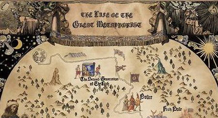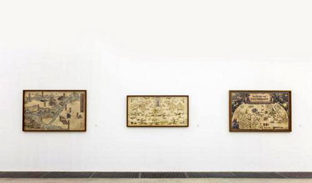 《大比喻家名著集萃》(2014)陈列在右翼大展厅,郭鸿蔚把每本名著的封面重新设计,将作者换成自己,然后印成丝网版画,替换原书的封面。除了有换汤不换药这类不深的比喻,似乎还有更加不仁慈的暗示:艺术(版画封面)是需要购买的,里面的内容(现成书)是白送的,又或者这类名著披上艺术的外衣后使人更加不愿也不敢去翻阅里面“真实”的内容了。郭鸿蔚在《大比喻家求真全图》用没有达到古代相应水准的画法描绘了从家到工作室的旅程。路本身用金粉颜料铺染而成,“黄金路”这种直白反而使人看了舒心。