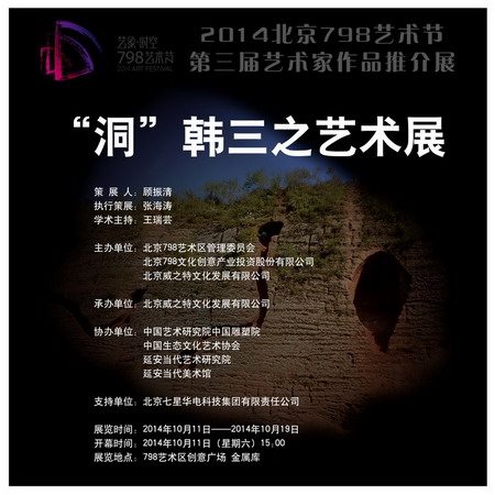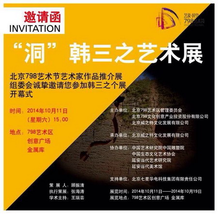 “洞”韩三之艺术展为北京798艺术节第3届艺术家作品推荐展首次推出个人展,由北京798艺术管委会、798创意产业投资股份有限公司、北京威之特文化发展有限公司主办,中国艺术研究院中国雕塑院、中国生态文化艺术协会、延安当代艺术研究院和延安当代美术馆协办,北京威之特文化发展有限公司承办。