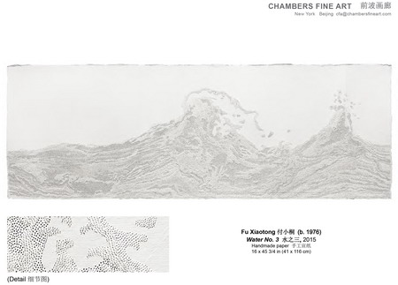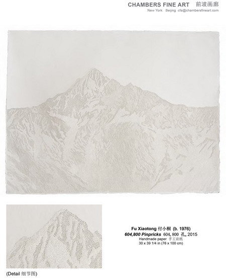 从传统意义上来说,针仅是运用于女性手工刺绣的一种工具。然而在付小桐手中,却成为了一种艺术创作手段,在纸上扎出成千上万个针眼。据付小桐描述,数以万计、朝着不同方向的细密针眼汇集在一起,变幻出山脉、波浪、以及源于大自然中其他景象的图案。