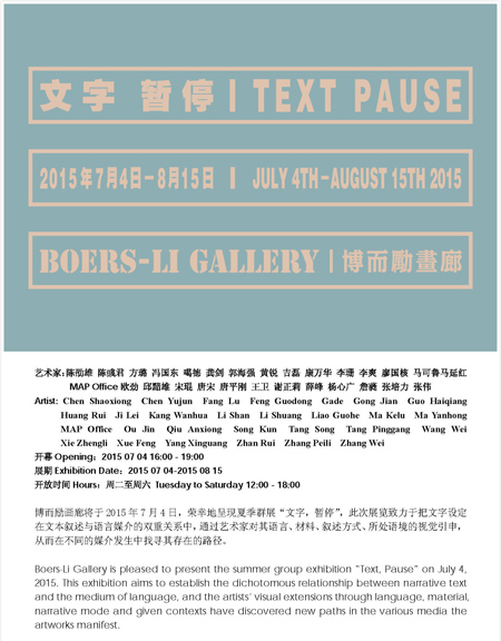 Boers-Li Gallery is pleased to present the summer group exhibition "Text, Pause" on July 4, 2015. This exhibition aims to establish the dichotomous relationship between narrative text and the medium of language, and the artists' visual extensions through language, material, narrative mode and given contexts have discovered new paths in the various media the artworks manifest.