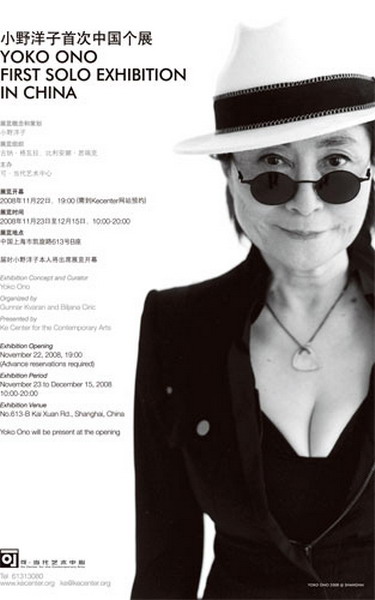 2008年11月22日洋子的首次国内个展《飞》在上海可当代艺术中心隆重揭幕。申城的秋雨挡不住人们热情高涨,可当代艺术中心汇聚了国内外最具影响力的艺术家,艺术爱好者,广场上到处人潮涌动,将洋子多年所呼吁的主题“世界和平与爱”推至高潮。今夜的可当代艺术中心四处洋溢着人们的热情,可谓是当代艺术界的又一盛会。