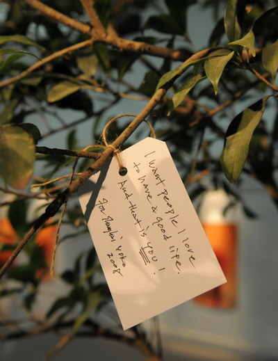 《愿望树》是小野洋子多年来一直坚持的一项生活装置作品,曾出现在许多重要的国际艺术展上。 “愿望树”是日本的一项传统民俗,人们会把各自的心愿写在小纸条上,绑在神社里的愿望树上来祈祷自己的幸福。然而幸福又是有多重意蕴的,它有多种指标和方向,收集愿望树上的纸条,小野洋子也就变成了一个各种愿望的收藏者。(摄影:Iain Macmillan)