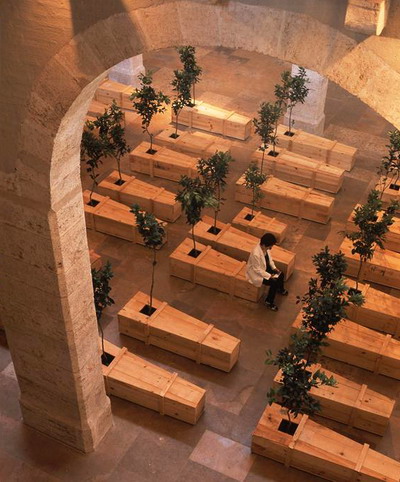 艺术家的说明要求普通的棺材,像是由于一场灾难,一场战役,一场屠杀成排摆放在一片荒野上的那种。树从每一个通常可以看到死者面部位置的开口生长出来。这种非同寻常的棺材场面激起并扰乱了观众,打断了我们的思维意识和信仰。它是一个内心无声地萌发,而这种无声来自于悲伤和孤寂环境下的无声本身。小野洋子在这对人类处境和生存的脆弱,以及对那场戏剧性死亡之后重获希望的无把握性,以及对这匿名的再生进行了动人且直接地思考。作品的题目看起来像在暗示生命的出口,或是对某人的放弃,失去他固有的名字或命名事情的能力。(摄影:Miguel Angel Valero)